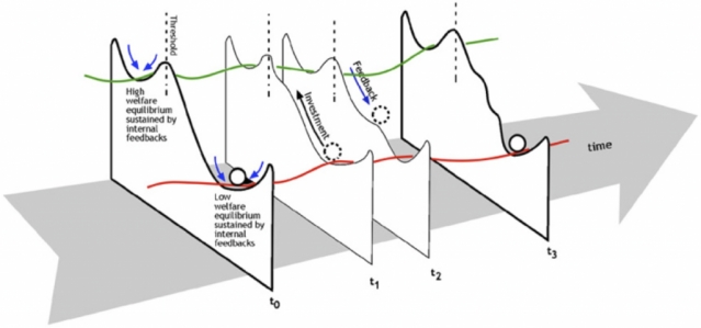 Dans la pratique, les choses ne sont toujours aussi simples que la représentation de la Figure 3, et le concept de résilience s’entend dans une trajectoire de développement d’un système, qui peut être fortement influencée par les pressions extérieures, mais aussi et surtout par les mécanismes de rétroaction (feedbacks) internes au système. La Figure 4 représente le fait que, lorsque plusieurs équilibres économiques (low and high welfares), il y a un seuil critique qui sépare les équilibres stable et instable. Le passage de t0 à t3 illustre que des malgré des changements possibles des conditions extérieures - croissance économique nationale ou régional p.ex. (représentées par la forme de la courbe) les deux équilibre principaux auraient tendance à persister. Les revenus inférieurs au temps t0 ne parviennent par à atteindre l’équilibre supérieur, malgré des investissements (p.ex. mise en place d’un système d’irrigation en zone aride) supposés améliorer la situation (t1), en raison de feedbacks internes au système (p.ex. le manque de compétence technique pour valoriser l’irrigation) (t2), qui repoussent le système en arrière vers l'équilibre inférieur (t3). Pour échapper à ce « piège à pauvreté », des investissement initiaux plus importants seraient nécessaires (p.ex. en formation des agriculteurs) afin que le système puisse modifier son équilibre.