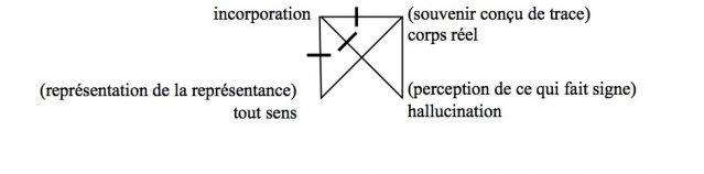L’essentiel à entendre ici est que, pas plus qu’aucun objet, le corps n’est un donné pur et simple, il n’a d’autre existence que significantisé, non pas que le réel se contenterait d’être secondairement symbolisé, mais le « pur » signifiant S1 (pour moi, la signifiance) s’implique dans le corps biologique pour le construire subjectivement à partit de ce qui s’en appréhende réversivement comme trace s’imprimant comme souvenir dans le corps (en dehors de toute conscience du sujet), comme signe prenant en compte le monde en tant que perçu, comme représentance constituée de représentations.
