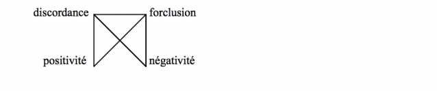 De cette irréalité on tire aussi la complexité de la négation, qui ne saurait être radicale et qui se distend entre discordance, forclusion, positivité et négativité (dans un schématisme quadrique). C’est encore une affaire d’incertitude.